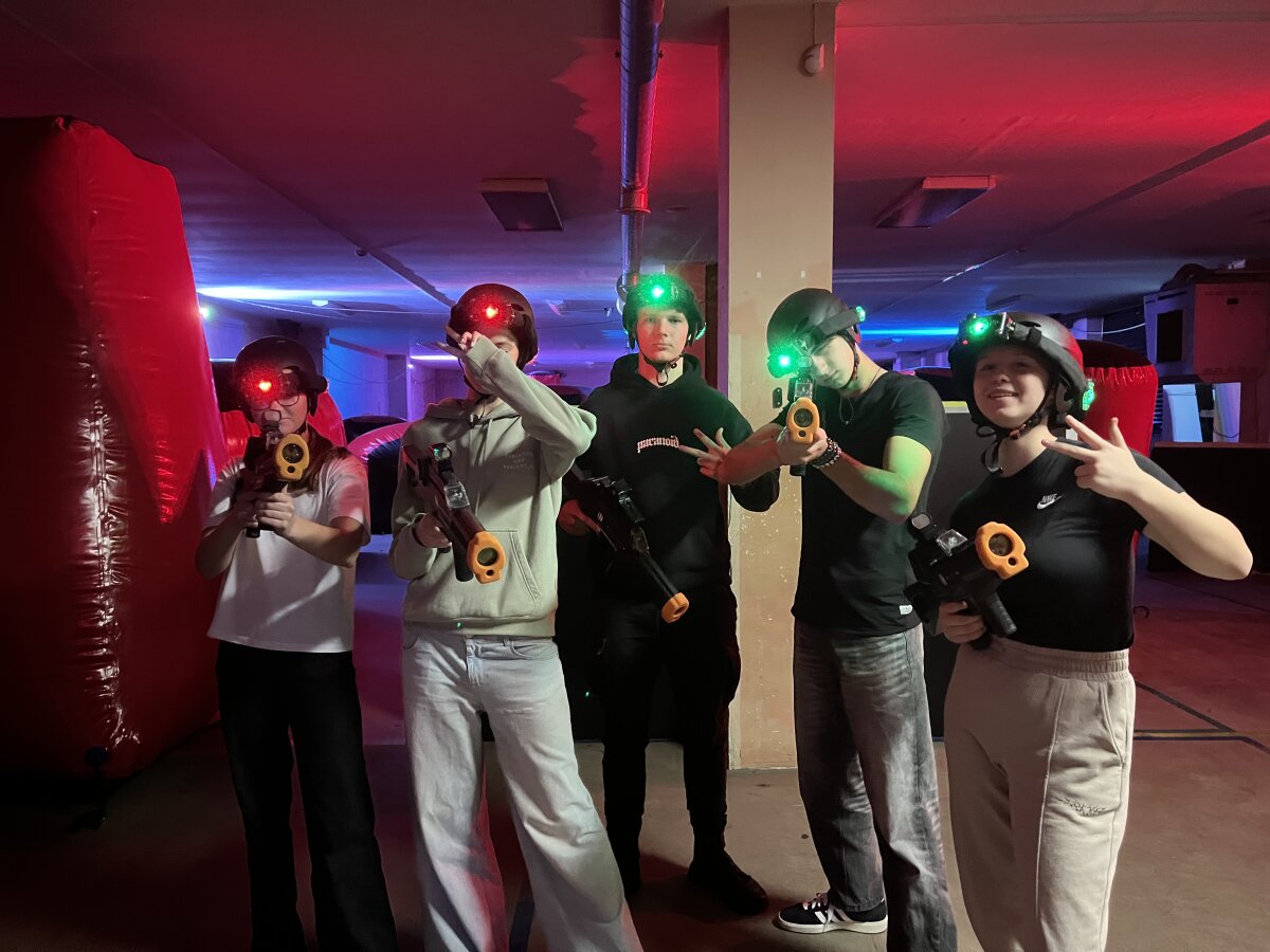 Ekskursijos pramoga - interaktyvus žaidimas - lazertronas. Žaidimo metu mes dalinomės į komandas, stengėmės „taikliai šauti“, užimti pozicijas, planuoti taktiką. Kova buvo draugiška, bet azartiška — puiki ir linksma dienos pabaiga.