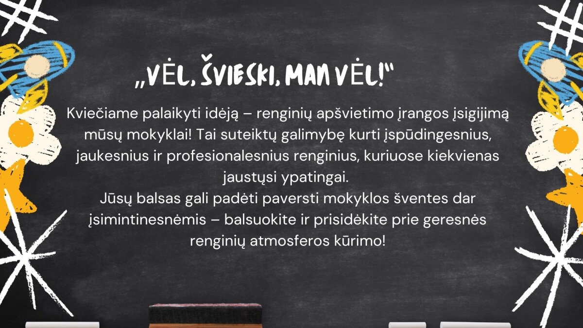 2. „Vėl, švieski, man vėl!” (IV a gimnazijos klasė) - renginių apšvietimo įrangos įsigijimas;