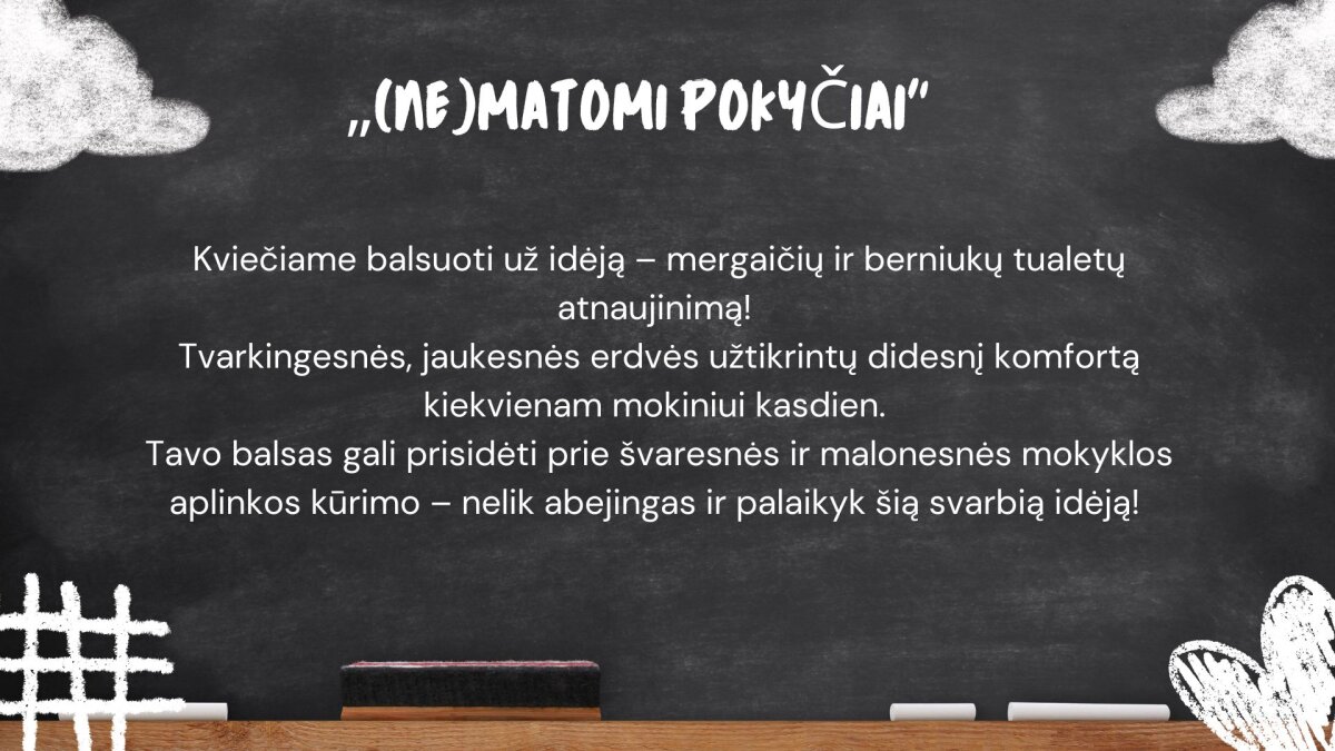 1. „(Ne)matomi pokyčiai“ (7 b klasė) - mergaičių ir berniukų WC atnaujinimas;