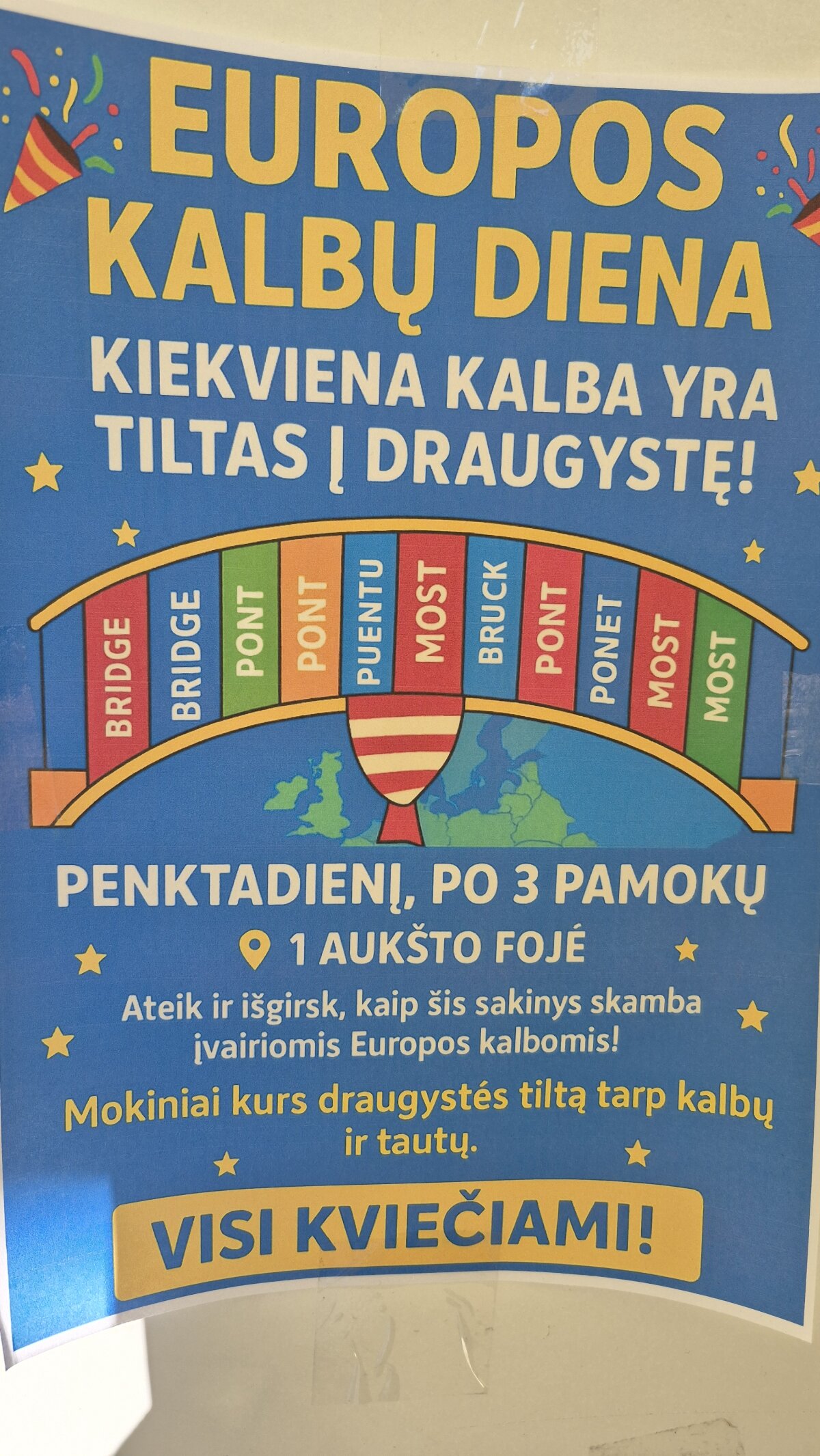 Rugsėjo 26-ąją visa Europa mini Tarptautinę Europos kalbų dieną, kuri kasmet primena, kad kalbos yra ne tik bendravimo priemonė, bet ir tiltas tarp kultūrų, tradicijų bei žmonių. Ši diena skatina domėtis kalbų įvairove, atrasti jų grožį bei suprasti, kad kiekviena kalba atveria naujus horizontus.