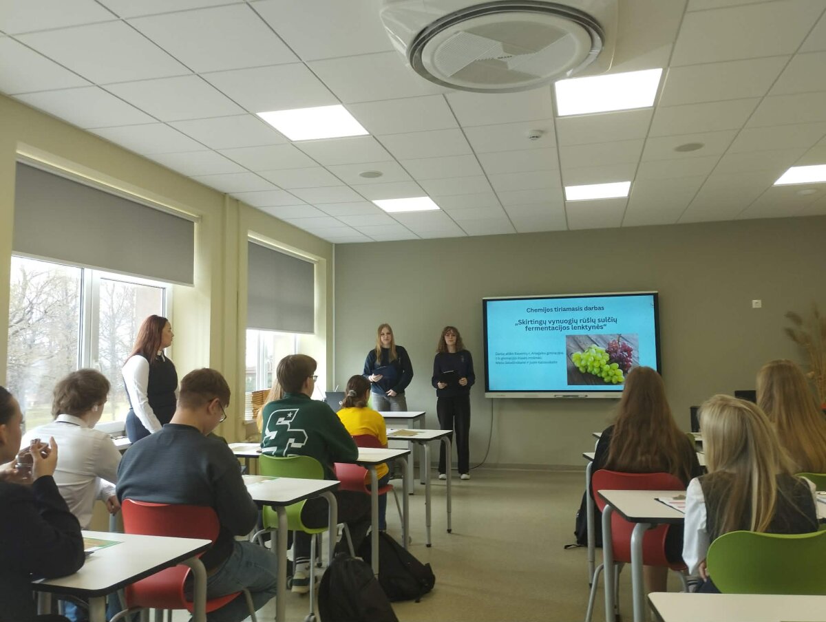 II b gimnazijos klasės mokinės Meda Sabašinskaitė ir Justė Kazlauskaitė chemijos tiriamąjį darbą „Skirtingų vynuogių rūšių sulčių fermentacijos lenktynės“;