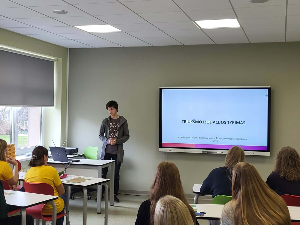 III a gimnazijos klasės mokinys Marius Šikšnys fizikos tiriamąjį darbą „Garso izoliacijos tyrimasׅ“.