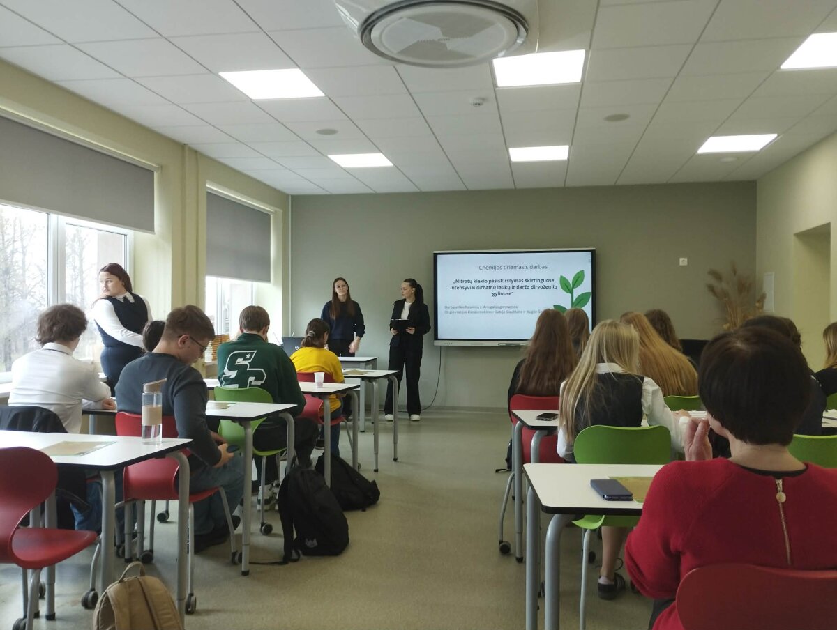 I b gimnazijos klasės mokinės Gabija Siautilaitė ir Rugilė Šmuilytė chemijos tiriamąjį darbą „Nitratų kiekio pasiskirstymas skirtinguose intensyviai dirbamų laukų ir daržo dirvožemio gyliuose“;