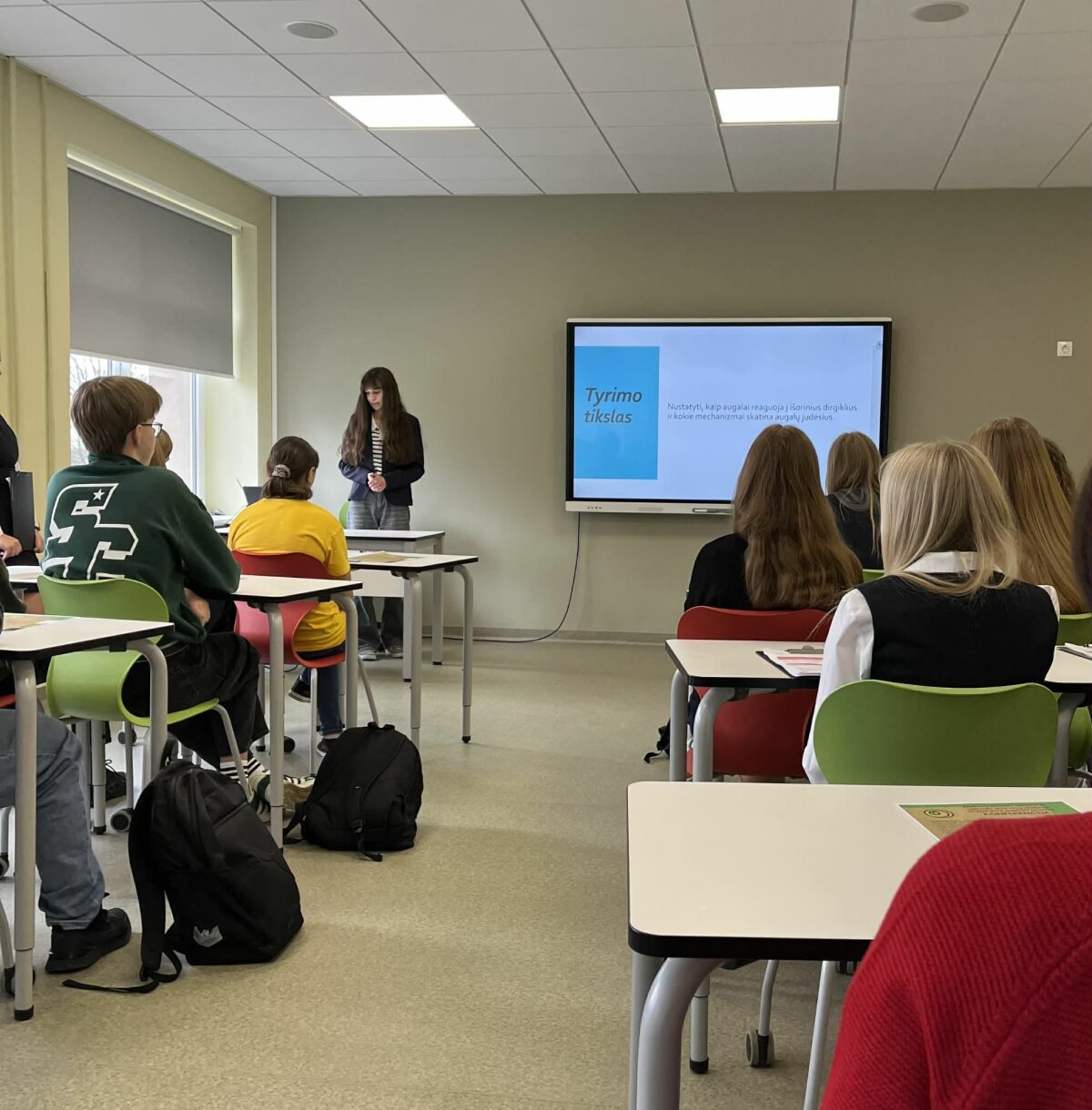 III a gimnazijos klasės mokinė Urtė Gudelevičiūtė biologijos tiriamąjį darbą „Augalų judesiai – reakcija į išorinius dirgiklius“;