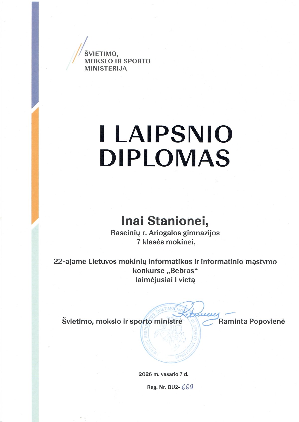 Didžiulė garbė, kad tarp nugalėtojų nuskambėjo ir Raseinių r. Ariogalos gimnazijos vardas. Gimnazijos mokinė Ina Stanionė tapo respublikinio etapo nugalėtoja 7 klasių grupėje. Už puikų pasirodymą konkurse ji buvo apdovanota Lietuvos Respublikos švietimo, mokslo ir sporto ministerijos (ŠMSM) I laipsnio diplomu, konkurso medaliu bei atminimo dovanėle.