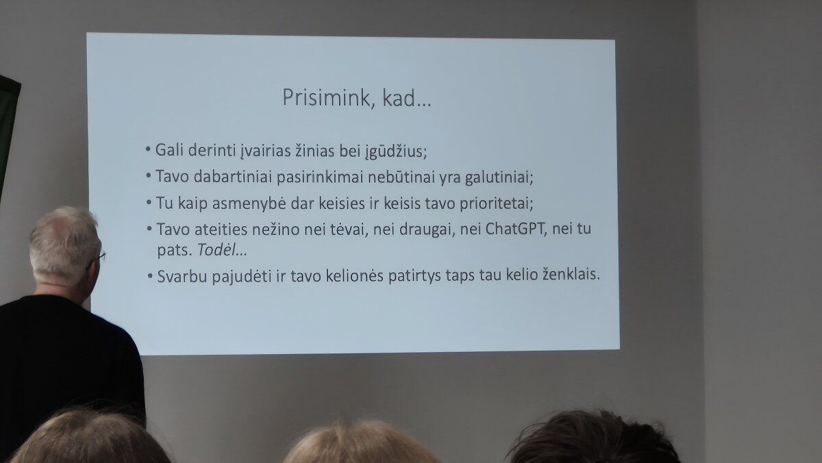 Svarbiu savaitės akcentu tapo II gimnazijos klasės mokinių išvyka į Raseinius, į Profesijų mugę „Drąsiai pirmyn!“. Čia mokiniai galėjo „pasimatuoti“ įvairias profesijas: kalbėjosi su dešimties aukštųjų mokyklų, dviejų profesinių mokyklų bei kitų įstaigų atstovais, domėjosi studijų kryptimis, rinko informaciją, ieškojo sau tinkamiausio kelio. Taip pat jie klausėsi įdomaus pranešimo „Kas bendro yra tarp draugų, tėvų ir ChatGPT?“ apie studijų pasirinkimą, kuris paskatino susimąstyti, kas iš tiesų daro didžiausią įtaką jaunų žmonių sprendimams. Mokiniai išvyką vertino labai palankiai – jie džiaugėsi galimybe gyvai susipažinti su profesijų įvairove, užduoti rūpimus klausimus ir geriau pažinti savo interesus.