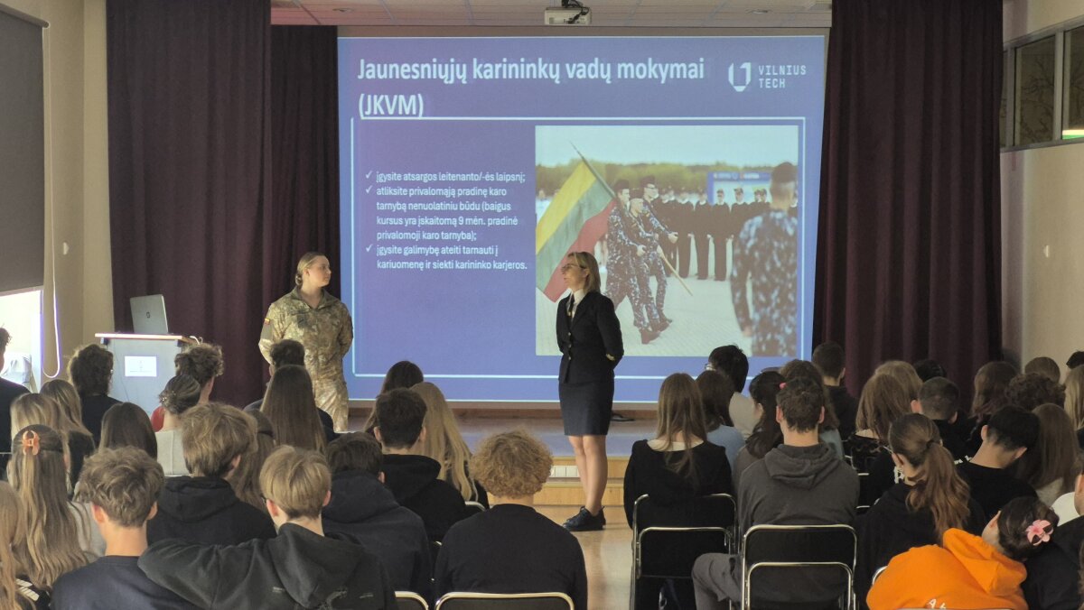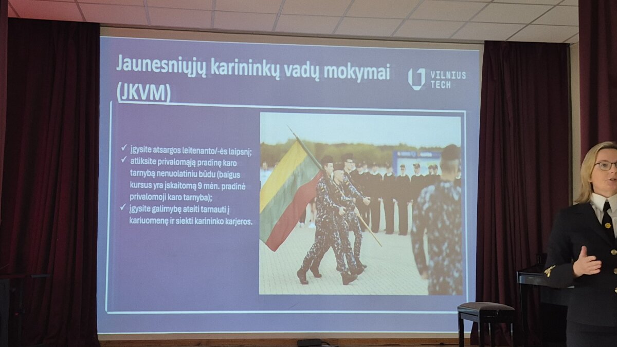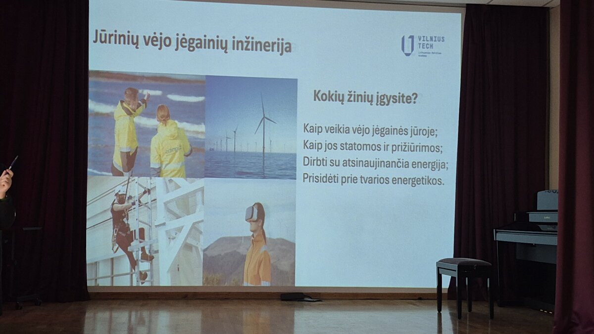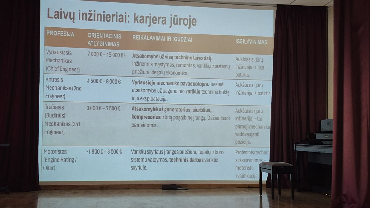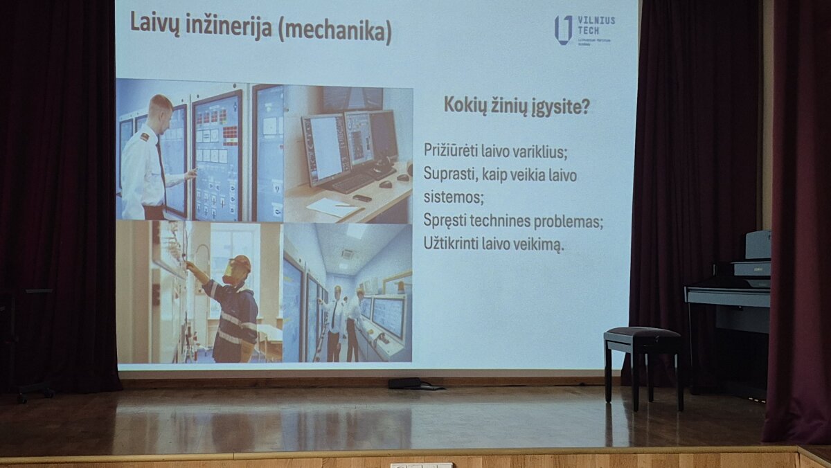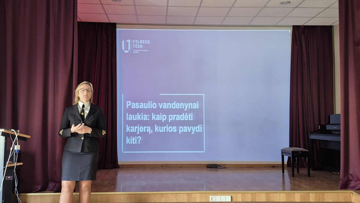 Savaitę vainikavo dar vienas įkvepiantis susitikimas – su Vilniaus TECH Jūreivystės akademijos atstovais iš Klaipėdos. Mokiniai sužinojo apie jūrinio transporto svarbą, laivų tipus, uostų veiklą, konteinerių terminalus, navigacijos principus ir GPS galimybes. Taip pat buvo pristatytos studijų programos, profesijų reikalavimai, reikalingi įgūdžiai, karjeros galimybės bei orientacinis atlyginimas. Įdomu tai, kad akademijoje vyksta ir Jaunesniųjų karininkų vadų mokymai – apie juos mokiniams pasakojo studentė Austėja.