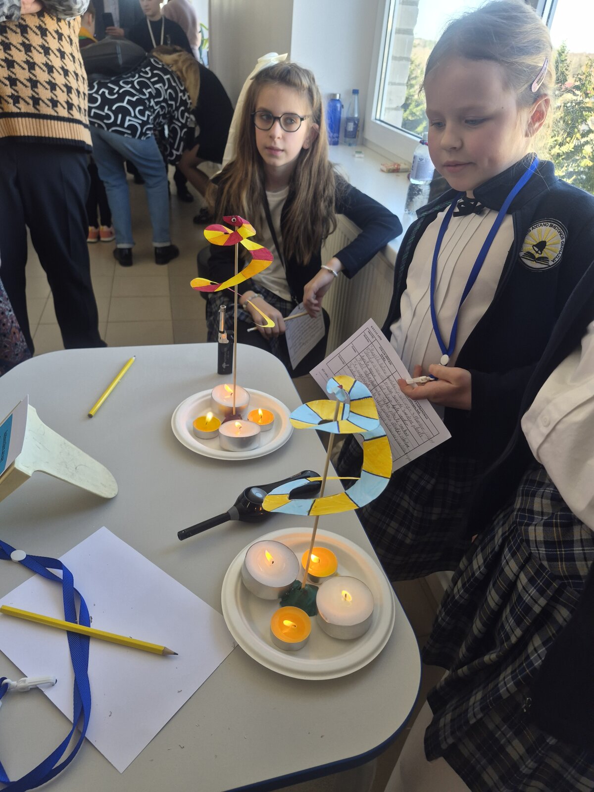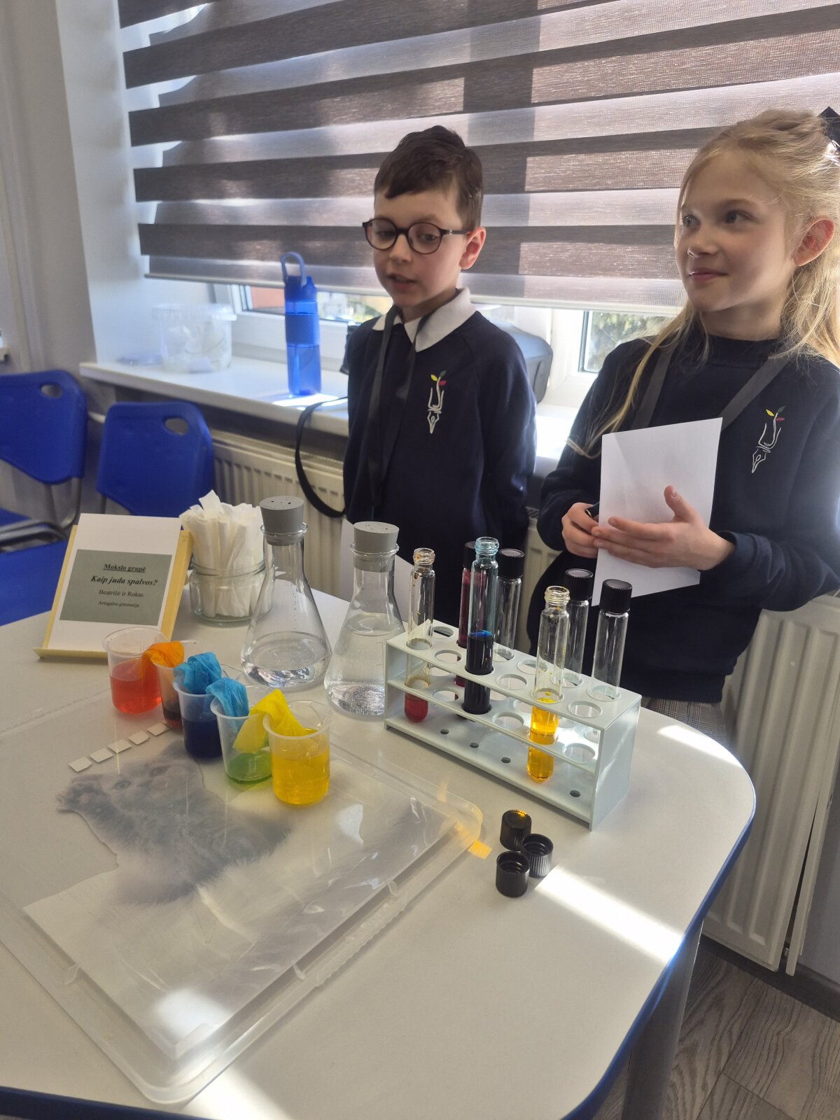 Puikiai pasirodė ir trečiokai Lukas Varga bei Ąžuolas Vaitkus. Jie pristatė darbą „Vandens ir markerio paslaptis“, kuriame atskleidė įdomius bandymų rezultatus ir savo atradimus, kaip specialaus markerio piešinėlis ant šaukšto, pastarąjį panardinus, lieka vandens paviršiuje. Mokinius konferencijai paruošė mokytoja Gabrielė Pukelytė.
