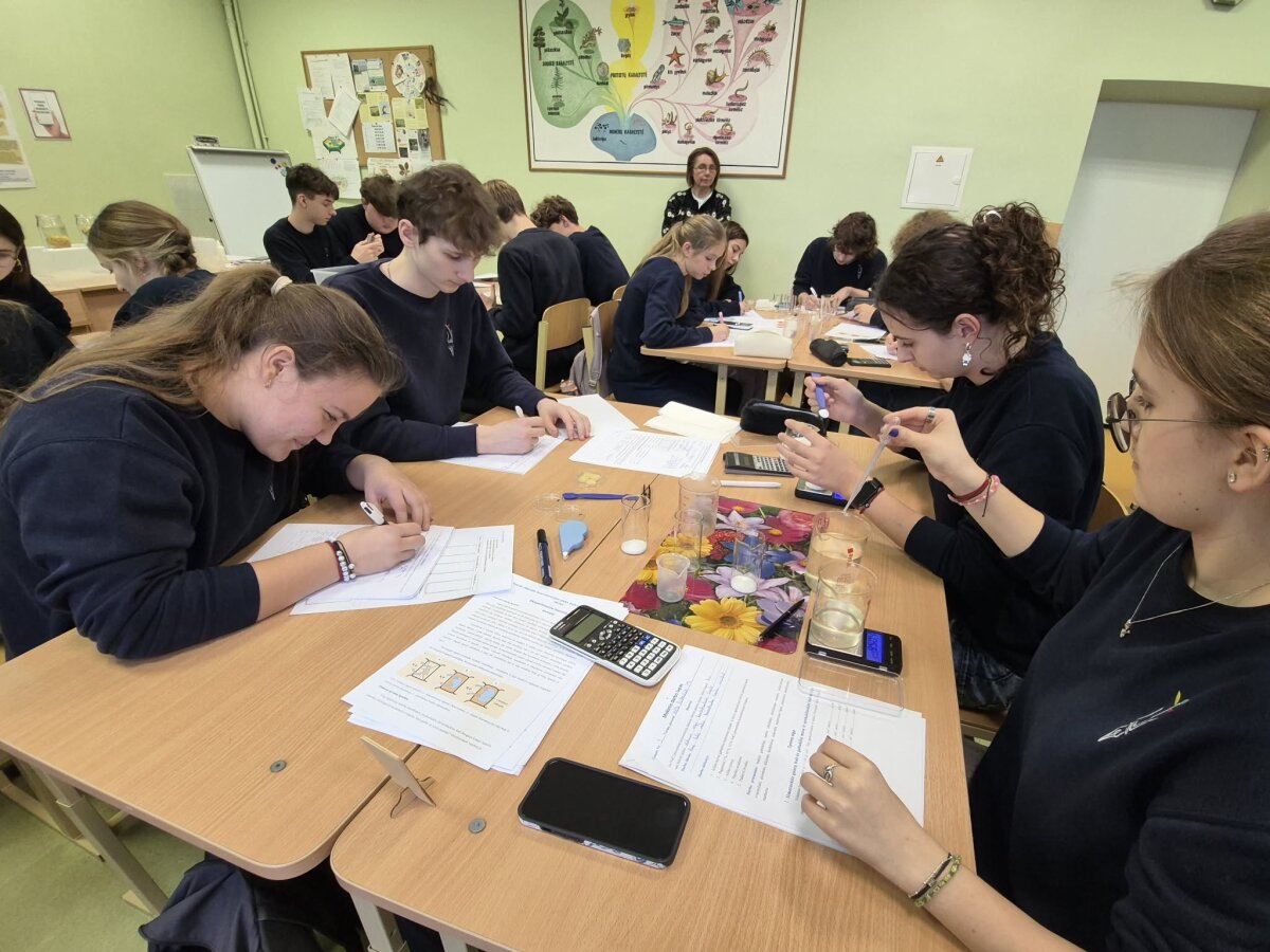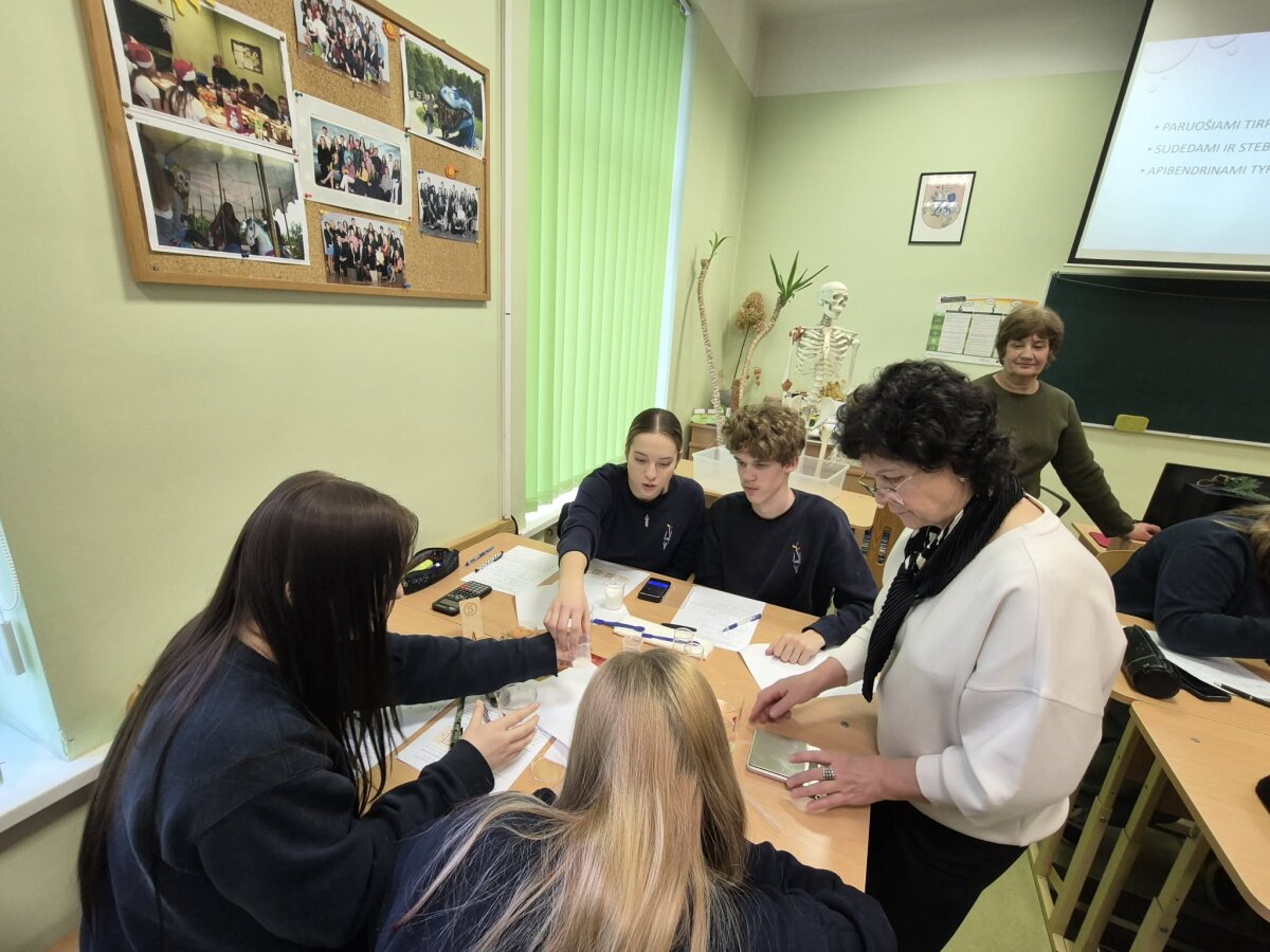 Gruodžio 9 d. I a gimnazijos klasei vyko integruota biologijos, fizikos ir chemijos pamoka „Natrio chlorido koncentracijos įtaka bulvės plūdrumui ir masei“. Pamokos metu mokiniai atliko tiriamąjį darbą, kurio tikslas – išsiaiškinti, ar natrio chlorido koncentracija daro įtaką bulvės plūdrumui tirpale ir kaip skirtingos koncentracijos keičia bulvės masę.
